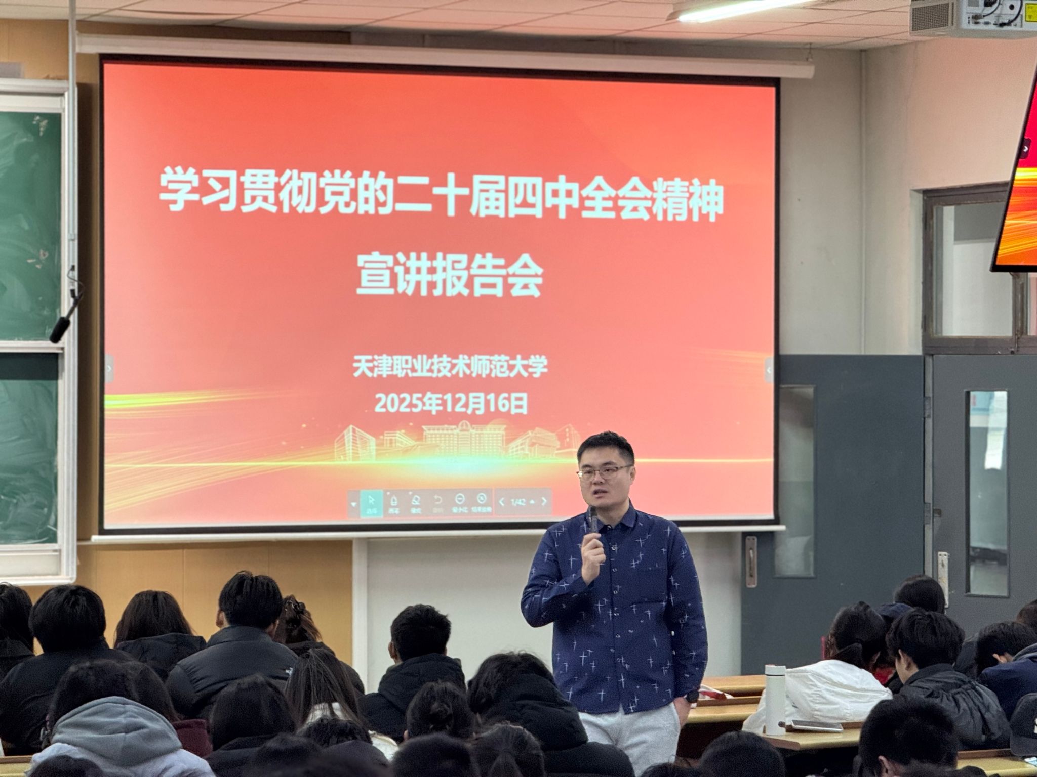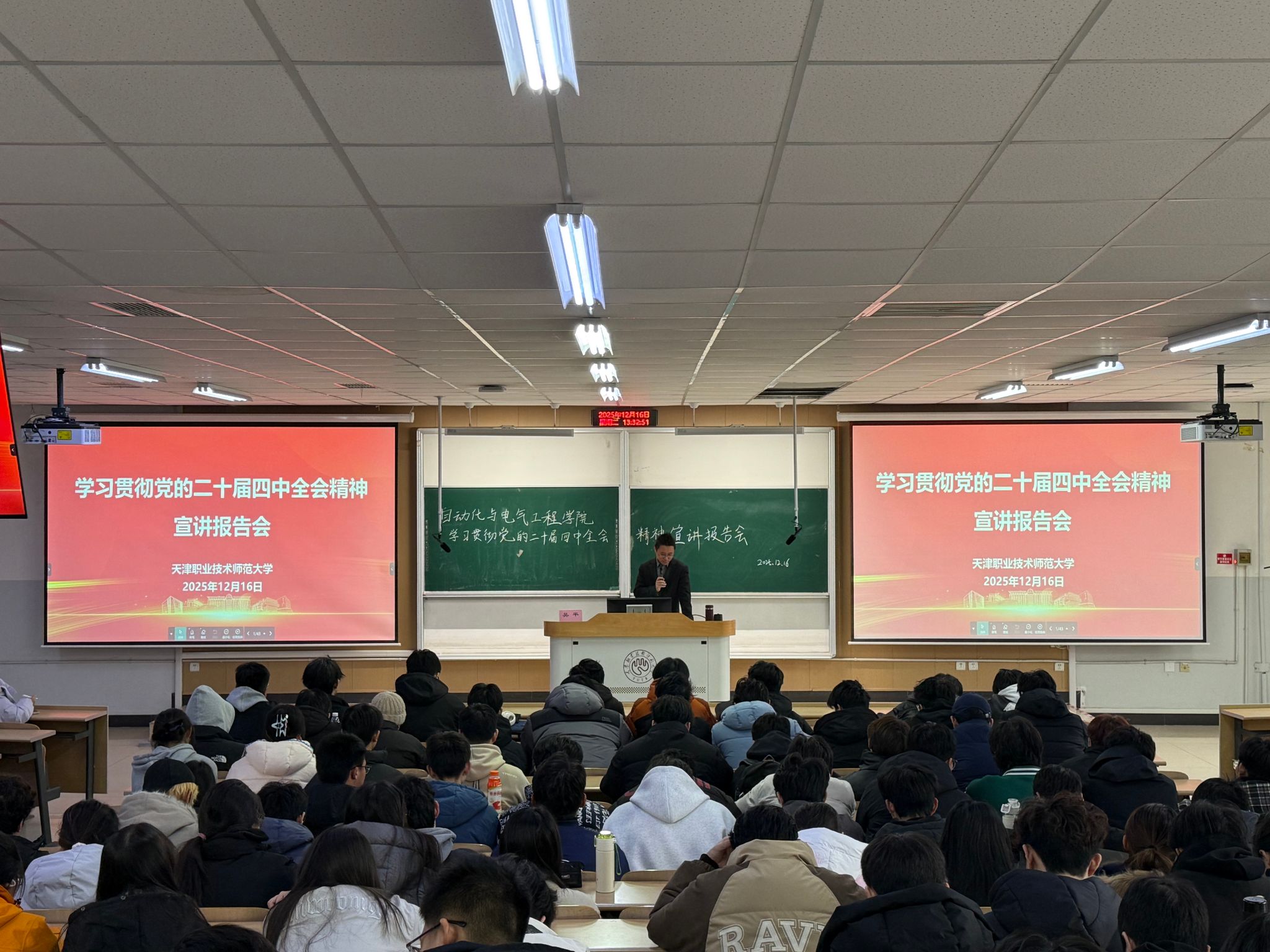 学院党委班子成员以“深入学习贯彻党的二十届四中全会精神奋力谱写中国特色、世界一流职业技术师范大学新篇章”为主题进行宣讲,紧紧围绕习近平总书记在党的二十届四中全会上的重要讲话精神和《中共中央关于制定国民经济和社会发展第十五个五年规划的建议》,对全会精神进行了全面系统、深入浅出的宣讲阐释,并紧密结合当前国内外形势和国家发展战略以及学校、学院“十五五”事业发展规划进行分析解读,引导学生深刻认识个人成长与国家发展的紧密联系,教育学生将专业学习与经济社会发展需求紧密结合,增强肩负强国使命的责任担当。