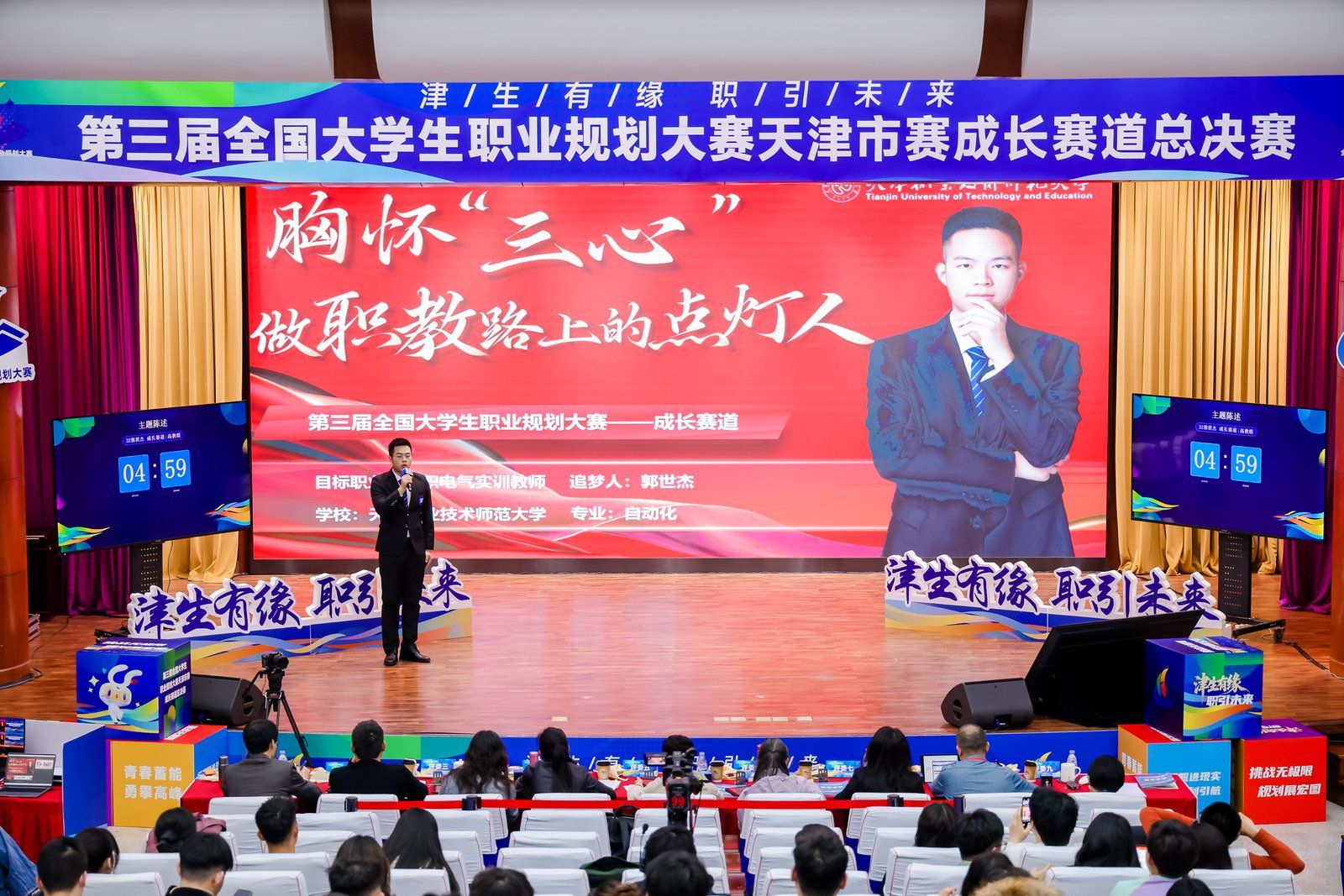 备赛期间,学院从组建指导团队、搭建模拟答辩场景等方式入手,为郭世杰提供了全方位的支持与指导,帮助他精准拆解自身能力短板,梳理清晰的能力提升路径。比赛过程中,郭世杰以自动化专业特色为切入点,将个人职业目标与行业发展趋势、国家产业需求紧密结合,将职业理想锁定为中职电气实训教师,以职普融通拓宽学生成长成才通道,服务教育强国建设。郭世杰凭借清晰的规划、出色的表现与沉稳的答辩,勇夺“成长赛道”天津赛金奖,并将继续冲击全国赛。